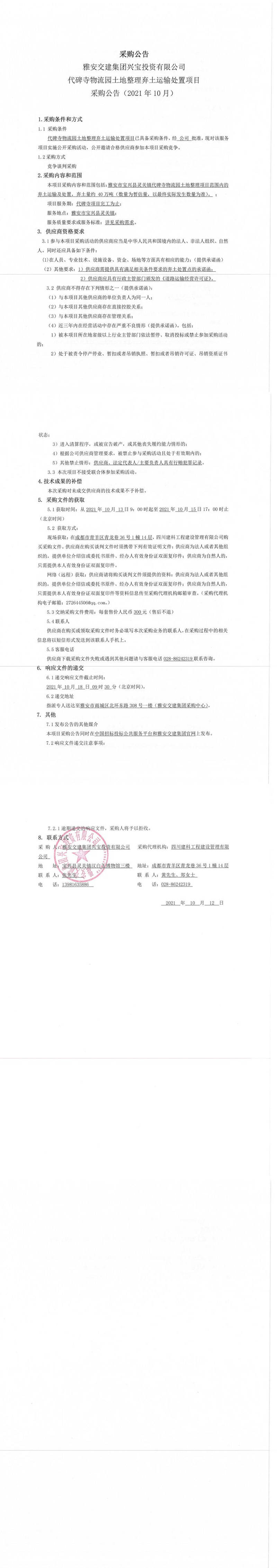雅安交建集團(tuán)興寶投資有限公司代碑寺物流園土地整理?xiàng)壨吝\(yùn)輸處置項(xiàng)目采購公告