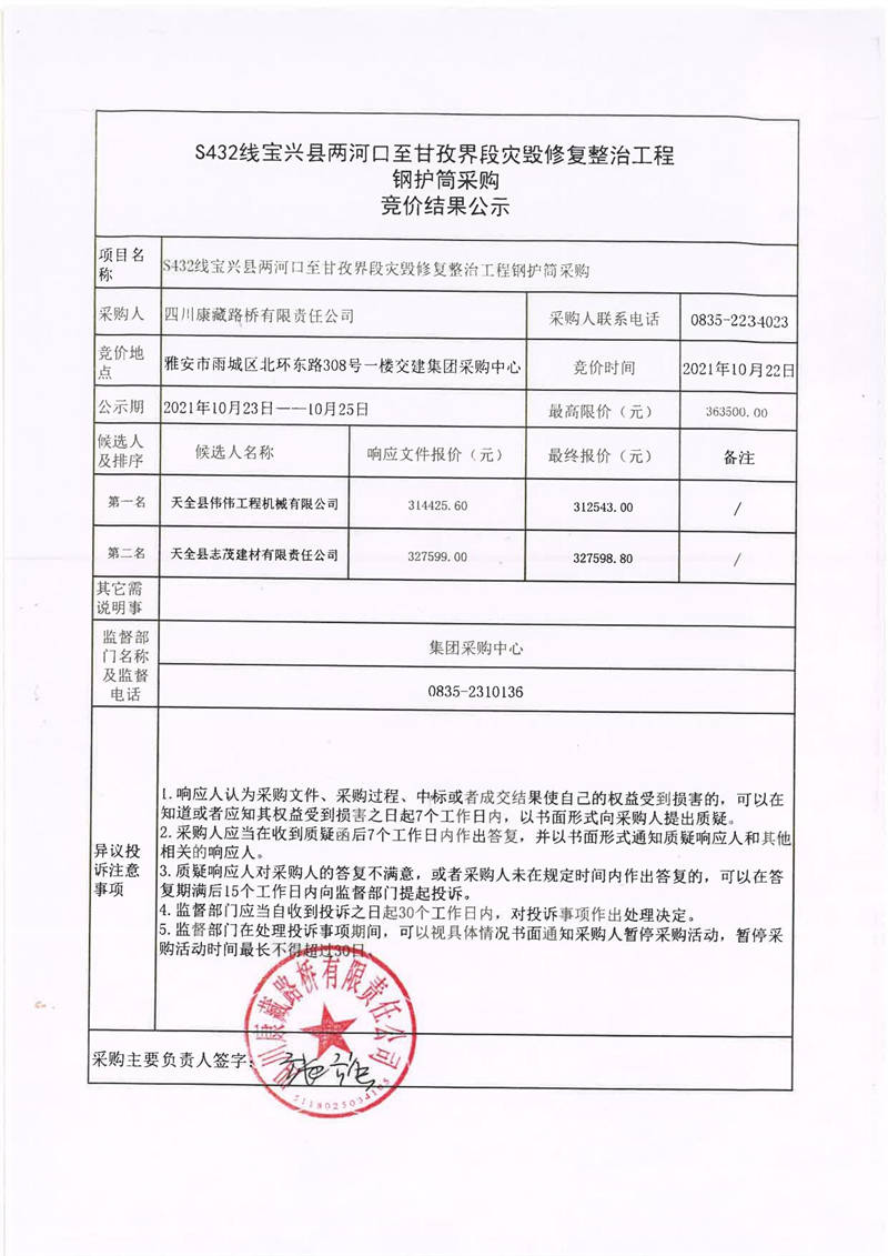 四川康藏路橋有限責任公司S432線寶興縣兩河口至甘孜界段災(zāi)毀修復(fù)整治工程鋼護筒采購競價結(jié)果公示