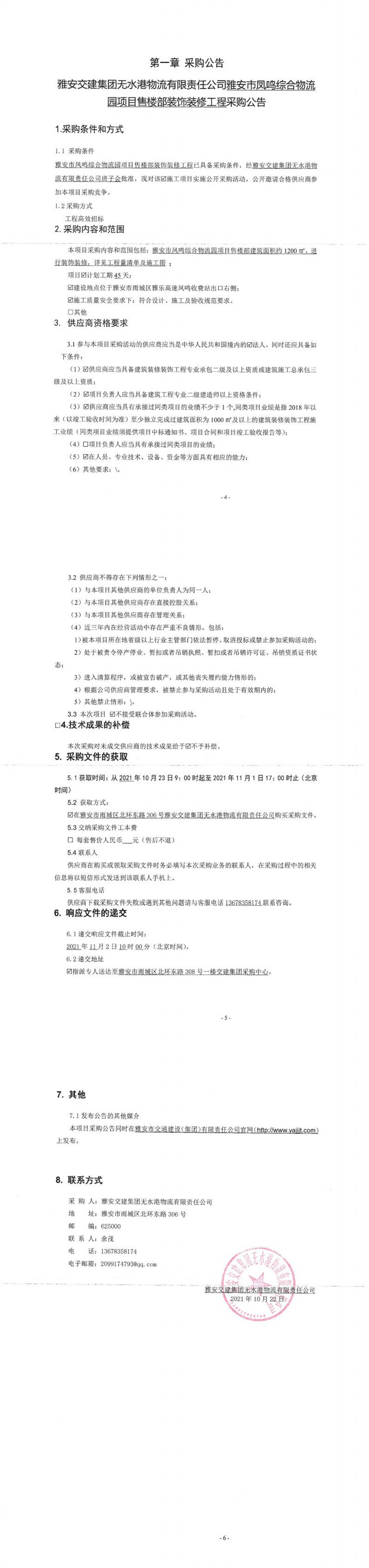 雅安交建集團無水港物流有限責(zé)任公司雅安市鳳鳴綜合物流園項目售樓部裝飾裝修工程采購公告