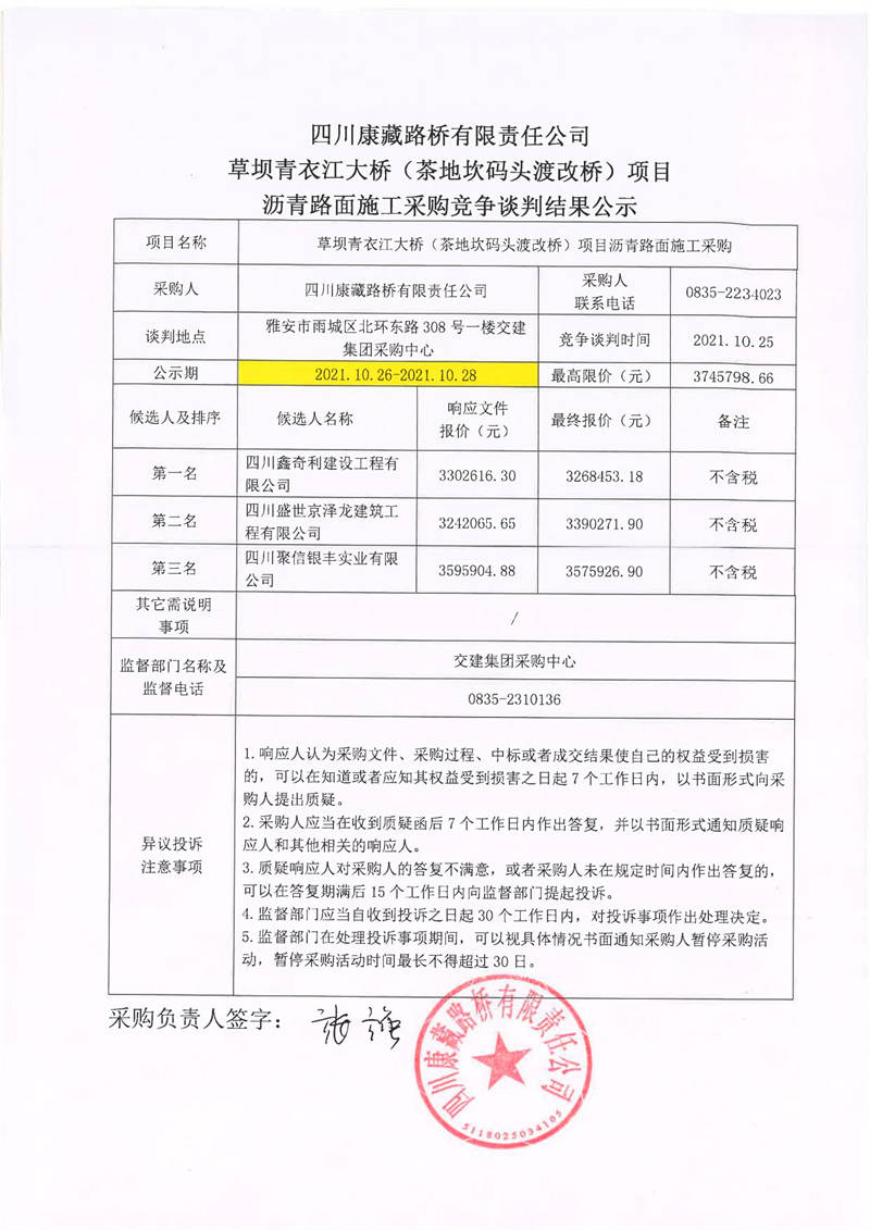 四川康藏路橋有限責(zé)任公司草壩青衣江大橋(茶地坎碼頭渡改橋)項(xiàng)目瀝青路面施工采購競爭談判結(jié)果公示