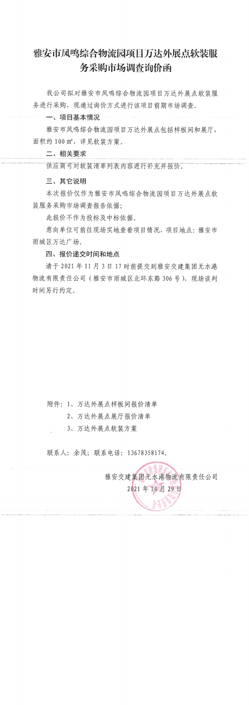 雅安交建集團(tuán)無水港物流有限責(zé)任公司雅安市鳳鳴綜合物流園項目萬達(dá)外展點軟裝服務(wù)采購市場調(diào)查詢價函