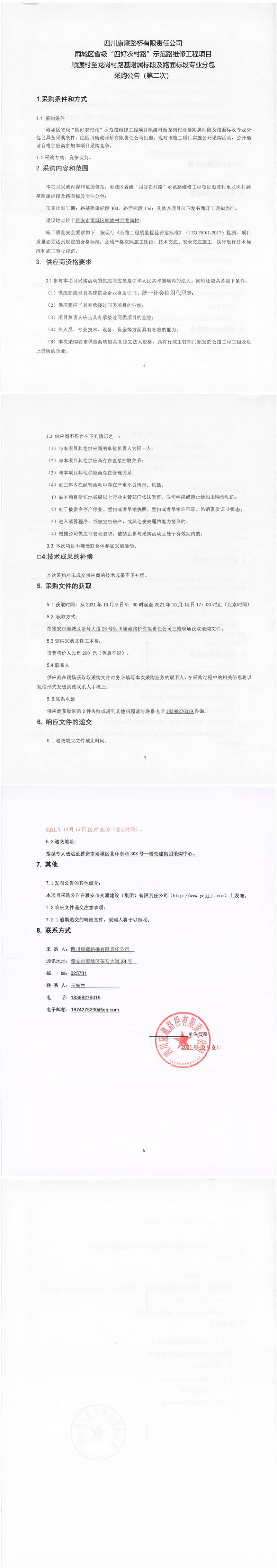 四川康藏路橋有限責(zé)任公司雨城區(qū)省級“四好農(nóng)村路”示范路維修工程項(xiàng)目順渡村至龍崗村路基附屬標(biāo)段及路面標(biāo)段專業(yè)分包采購公告(第二次)