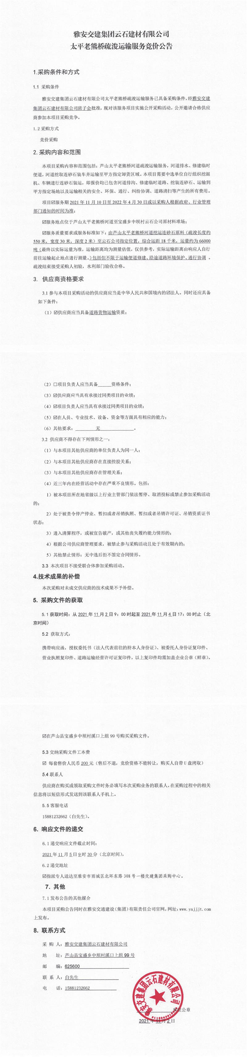 雅安交建集團(tuán)云石建材有限公司太平老熊橋疏浚運(yùn)輸服務(wù)競價(jià)公告
