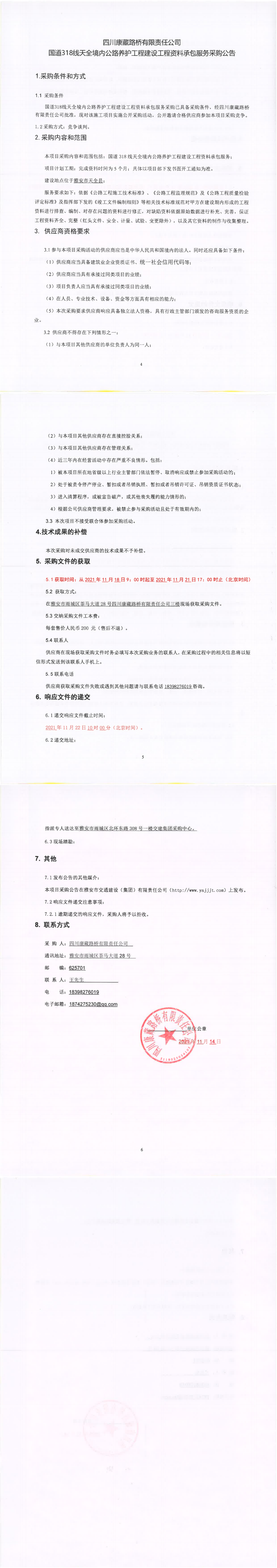 四川康藏路橋有限責任公司國道318線天全境內(nèi)公路養(yǎng)護工程建設工程資料承包服務采購公告