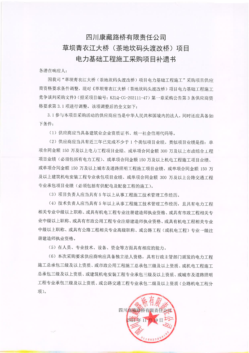 四川康藏路橋有限責(zé)任公司草壩青衣江大橋(茶地坎碼頭渡改橋)項目電力基礎(chǔ)工程施工采購項目補遺書