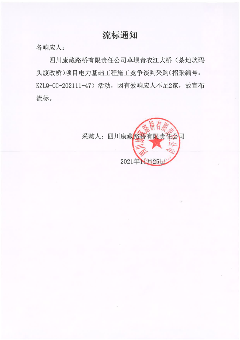 四川康藏路橋有限責(zé)任公司草壩青衣江大橋(茶地坎碼頭渡改橋)項(xiàng)目電力基礎(chǔ)工程施工競爭談判采購流標(biāo)通知