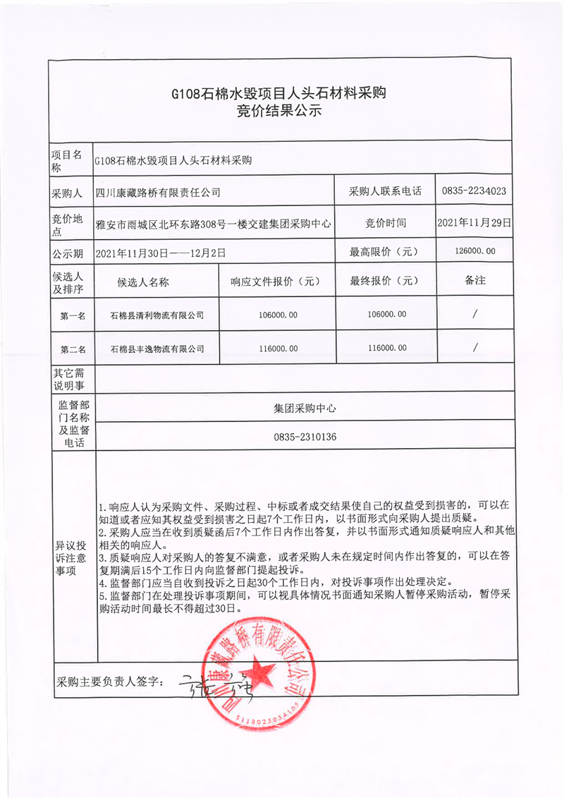 四川康藏路橋有限責任公司G108石棉水毀項目人頭石材料采購競價結果公示