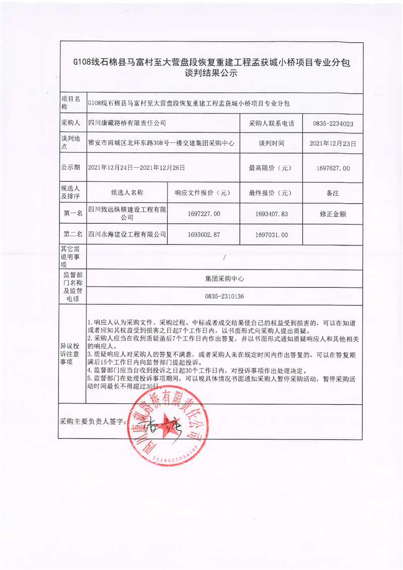 四川康藏路橋有限責(zé)任公司G108線石棉縣馬富村至大營(yíng)盤段恢復(fù)重建工程孟獲城小橋項(xiàng)目專業(yè)分包談判結(jié)果公示
