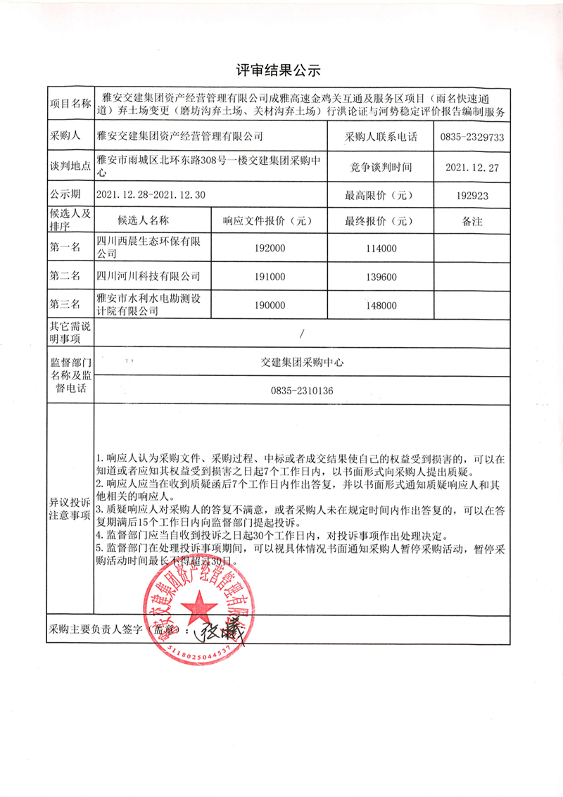 雅安交建集團(tuán)資產(chǎn)經(jīng)營管理有限公司成雅高速金雞關(guān)互通及服務(wù)區(qū)項(xiàng)目(雨名快速通道)棄土場變更(磨坊溝棄土場、關(guān)材溝棄土場)行洪論證與河勢穩(wěn)定評價報告編制服務(wù)評審結(jié)果公示