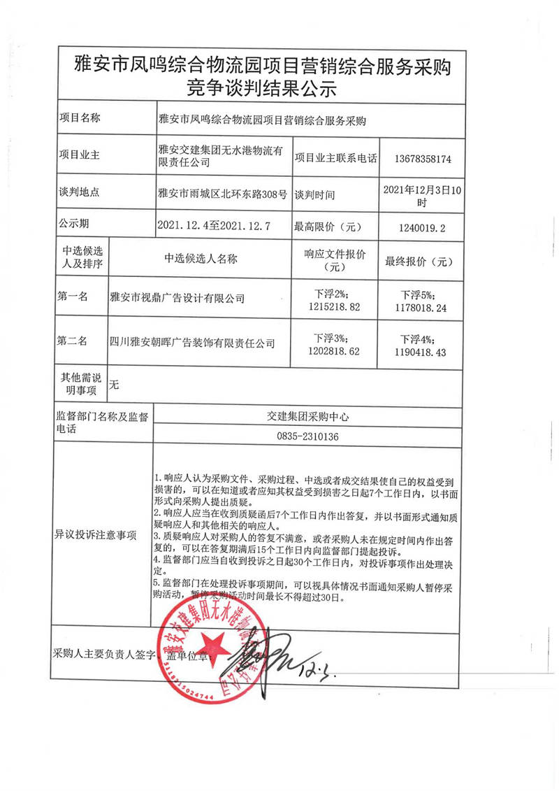 雅安交建集團(tuán)無水港物流有限責(zé)任公司雅安市鳳鳴綜合物流園項(xiàng)目營銷綜合服務(wù)采購競爭談判結(jié)果公示