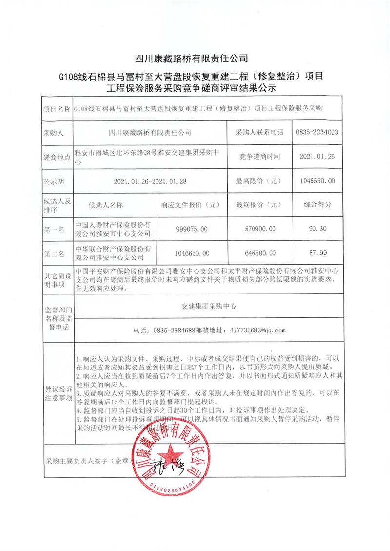 四川康藏路橋有限責(zé)任公司G108線石棉縣馬富村至大營(yíng)盤段恢復(fù)重建工程(修復(fù)整治)項(xiàng)目工程保險(xiǎn)服務(wù)采購(gòu)競(jìng)爭(zhēng)磋商評(píng)審結(jié)果公示