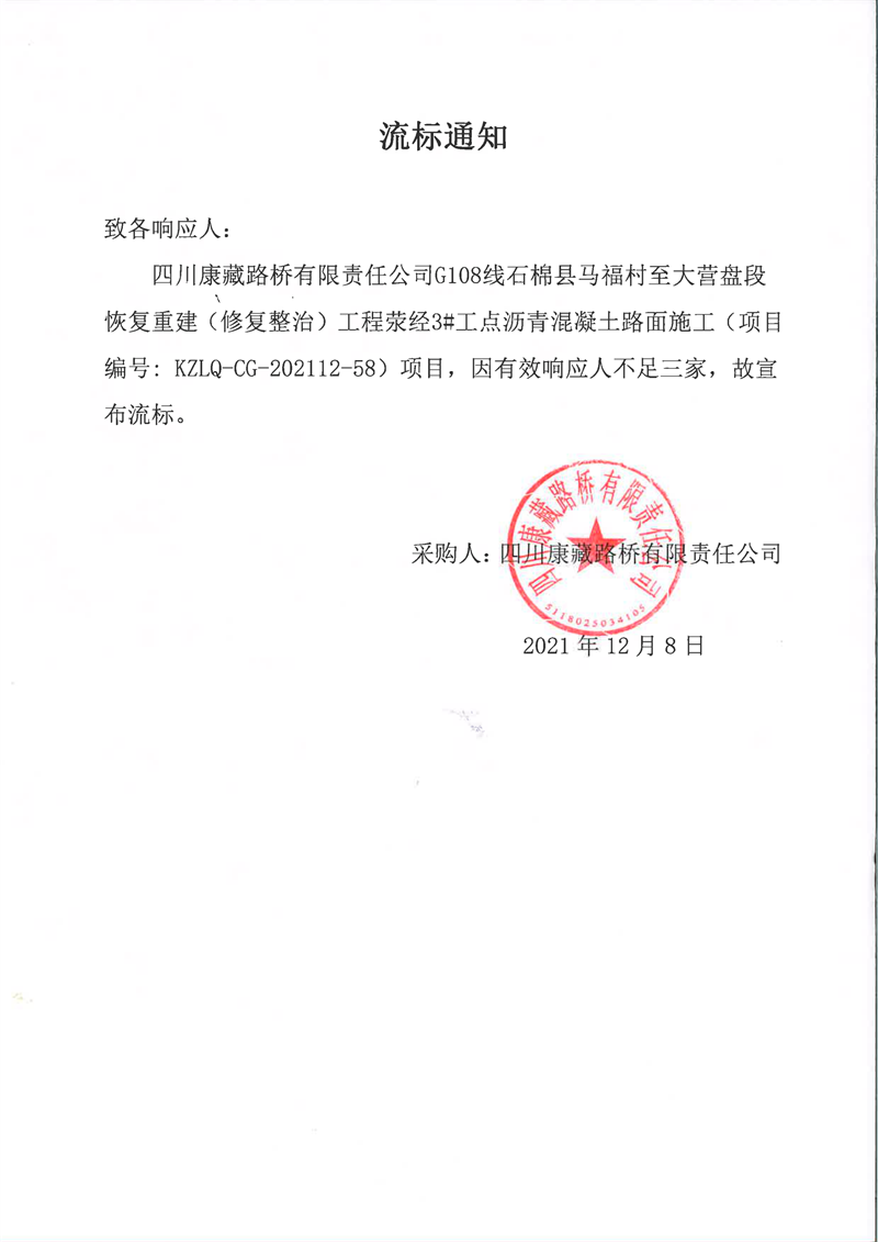 四川康藏路橋有限責(zé)任公司G108線石棉縣馬福村至大營盤段恢復(fù)重建(修復(fù)整治)工程滎經(jīng)3#工點瀝青混凝土路面施工流標(biāo)通知