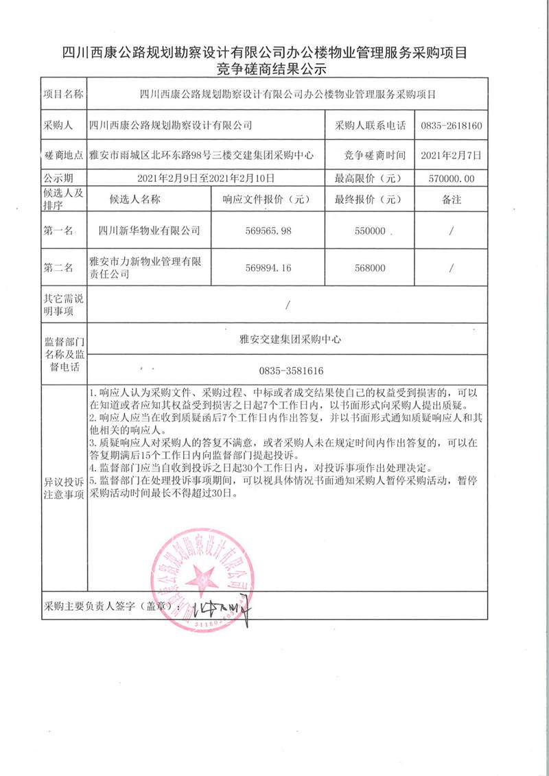 四川西康公路規(guī)劃勘察設(shè)計有限公司辦公樓物業(yè)管理服務(wù)采購項目競爭磋商結(jié)果公示