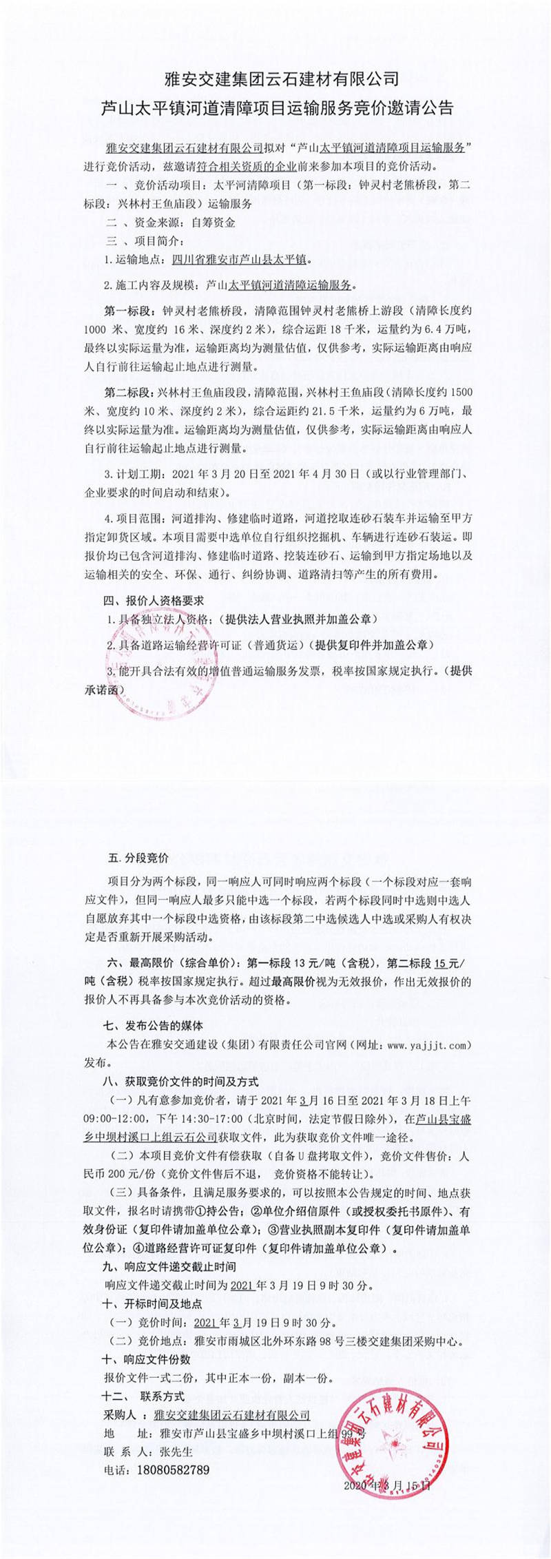 雅安交建集團(tuán)云石建材有限公司蘆山太平鎮(zhèn)河道清障項目運(yùn)輸服務(wù)競價邀請公告