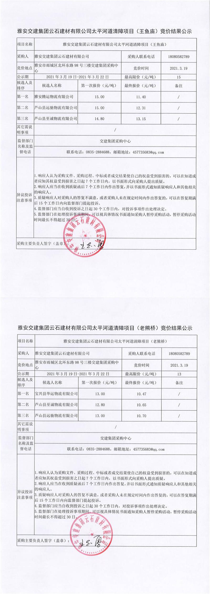 雅安交建集團(tuán)云石建材有限公司太平河道清障項目競價結(jié)果公示
