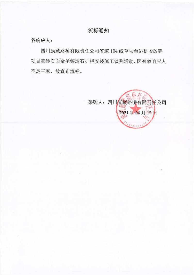 四川康藏路橋有限責(zé)任公司省道104線草壩至姚橋段改建項目黃砂石面金圣鑄造石護(hù)欄安裝施工流標(biāo)通知