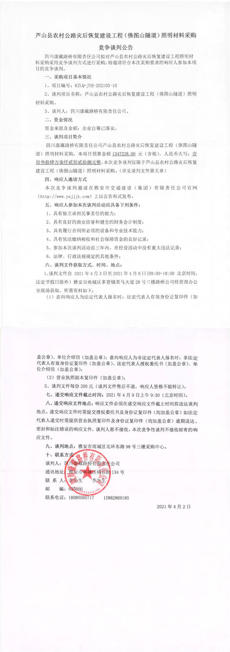 四川康藏路橋有限責任公司蘆山縣農(nóng)村公路災后恢復建設工程(佛圖山隧道)照明材料采購競爭談判公告