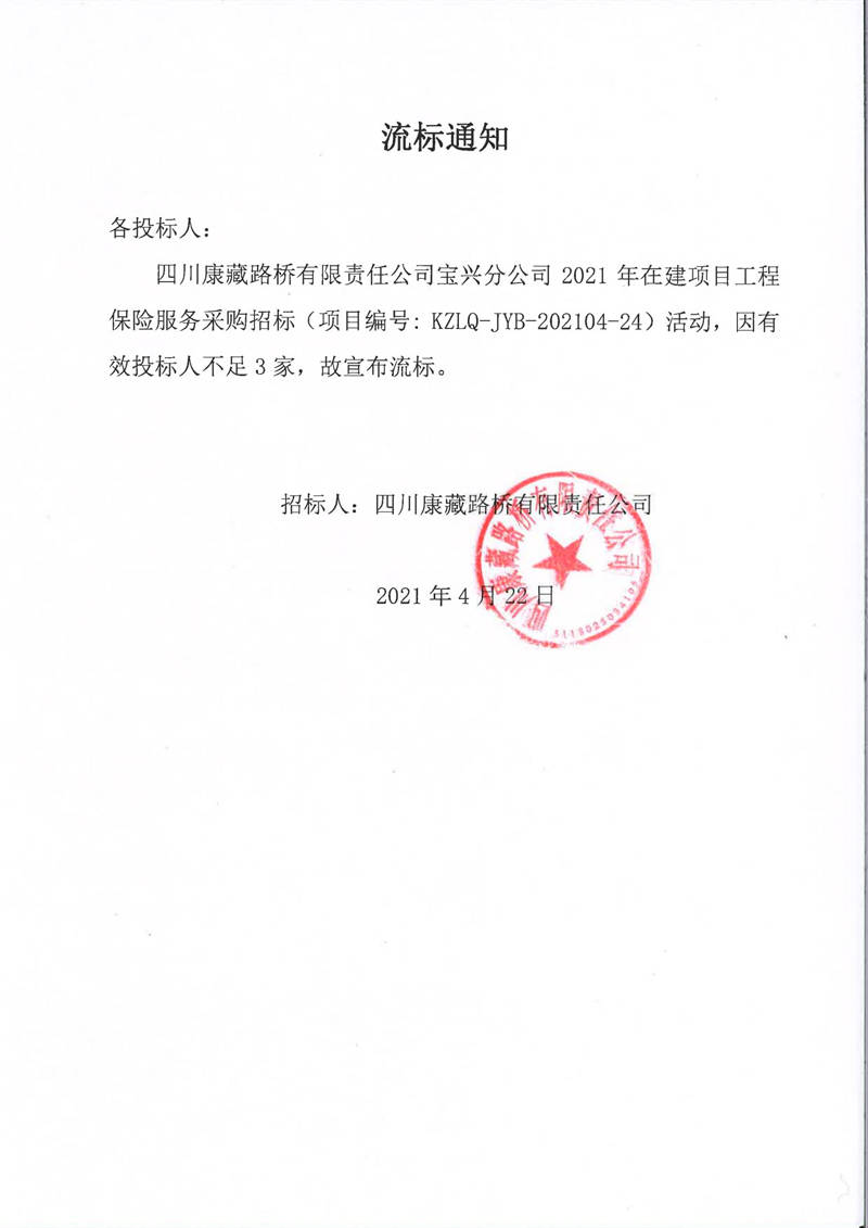 四川康藏路橋有限責任公司寶興分公司2021年在建項目工程保險服務(wù)采購流標通知