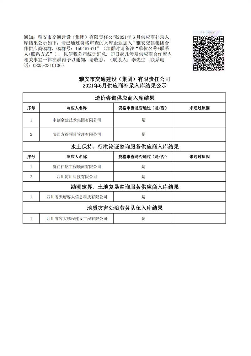 雅安市交通建設(集團)有限責任公司2021年6月供應商補錄入庫結果公示