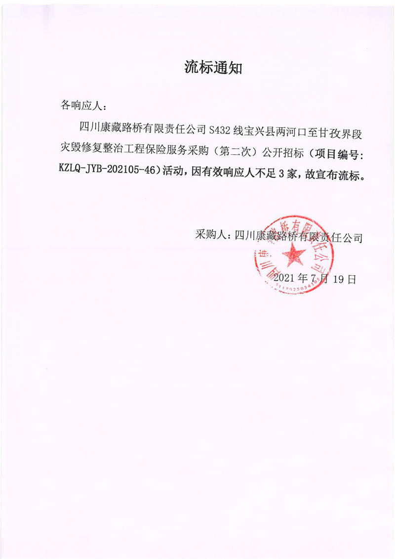 四川康藏路橋有限責任公司S432線寶興縣兩河口至甘孜界段災毀修復整治工程保險服務采購(第二次)流標通知