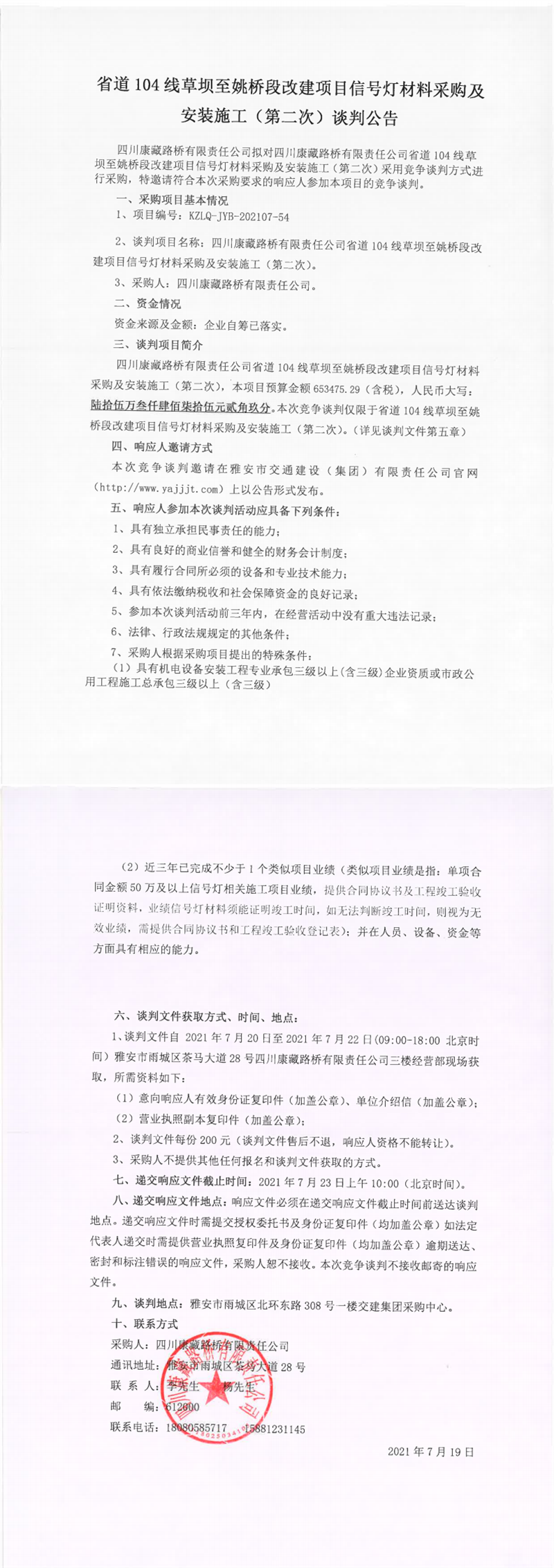 四川康藏路橋有限責(zé)任公司省道104線草壩至姚橋段改建項(xiàng)目信號(hào)燈材料采購及安裝施工(第二次)談判公告