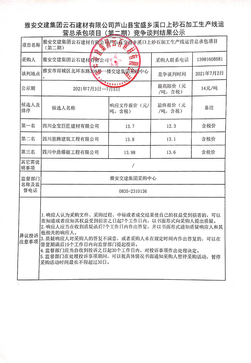 雅安交建集團(tuán)云石建材有限公司蘆山縣寶盛鄉(xiāng)溪口上砂石加工生產(chǎn)線運(yùn)營總承包項(xiàng)目(第二期)競(jìng)爭(zhēng)談判結(jié)果公示