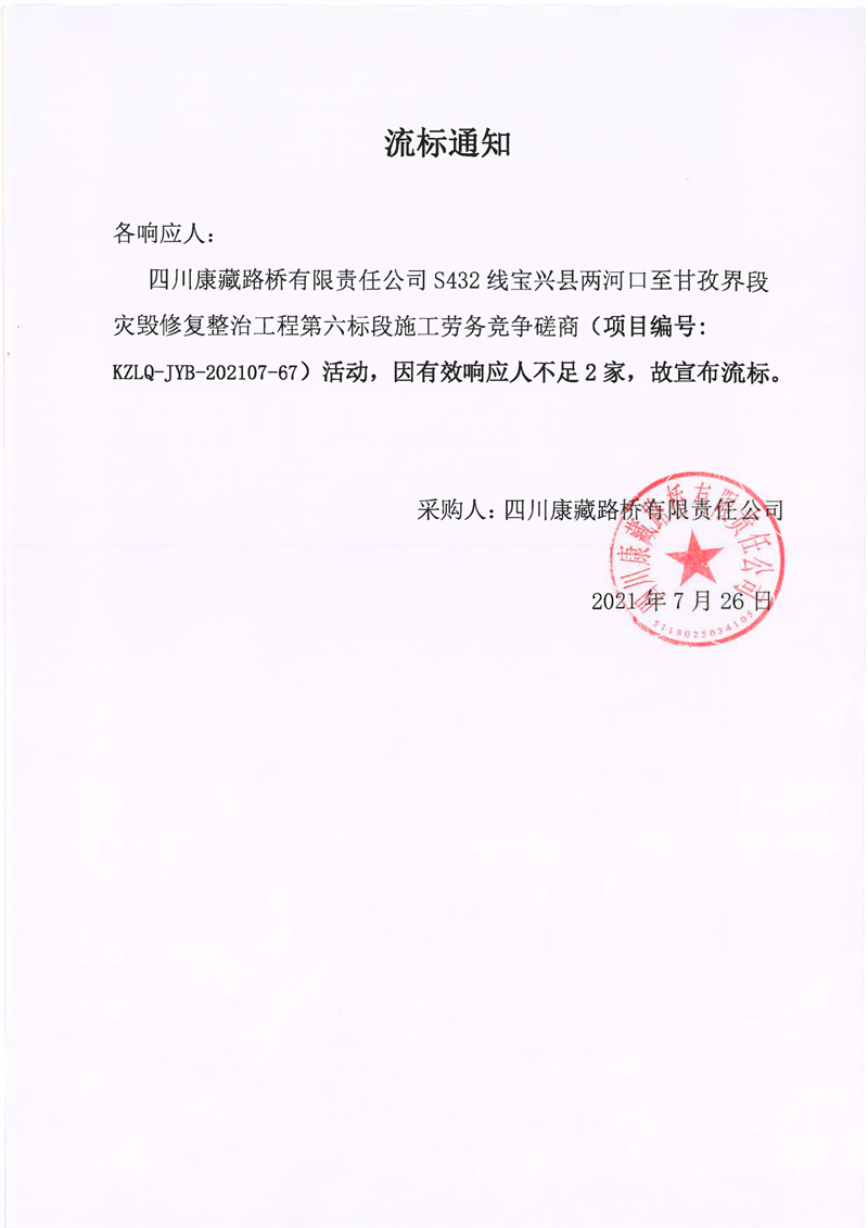四川康藏路橋有限責任公司S432線寶興縣兩河口至甘孜界段災毀修復整治工程第六標段施工勞務競爭磋商流標通知