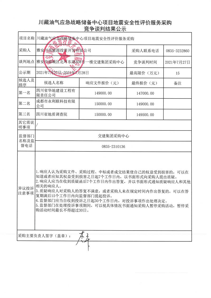 雅安川西能源投資開發(fā)有限公司川藏油氣應(yīng)急戰(zhàn)略儲備中心項目地震安全性評價服務(wù)采購競爭談判結(jié)果公示