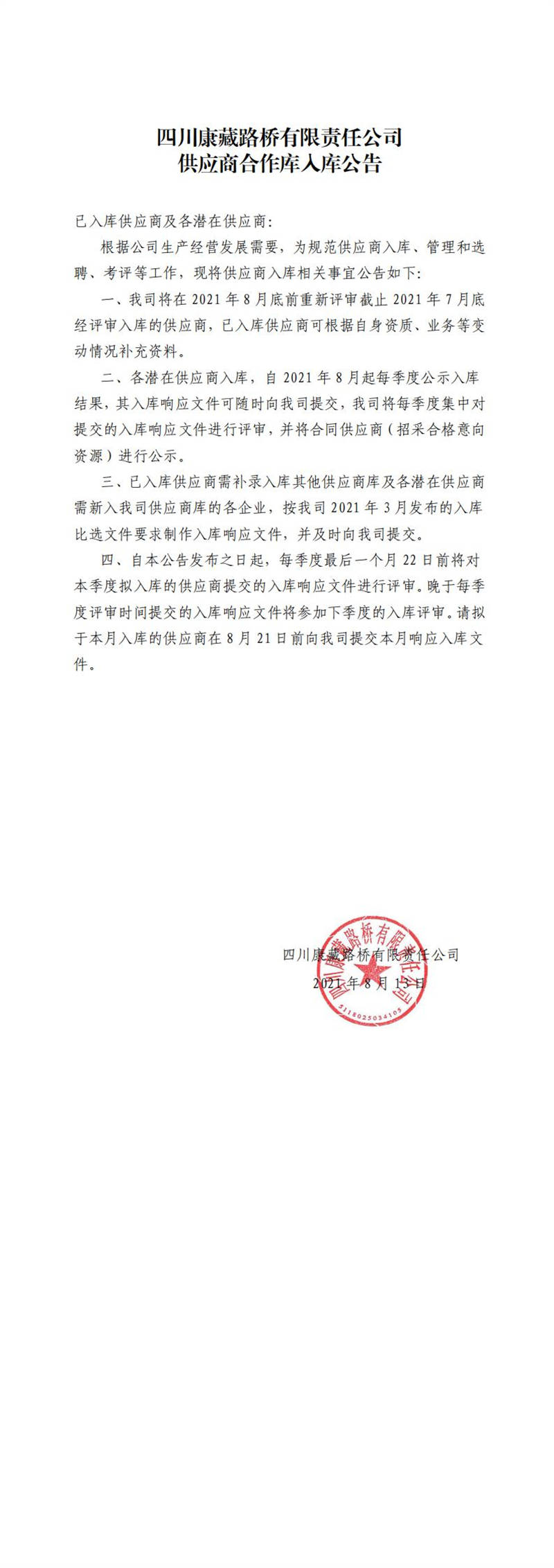 四川康藏路橋有限責任公司供應商合作庫入庫公告