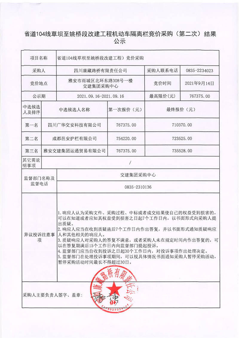 四川康藏路橋有限責(zé)任公司省道104線草壩至姚橋段改建工程機(jī)動(dòng)車隔離欄競價(jià)采購(第二次)結(jié)果公示