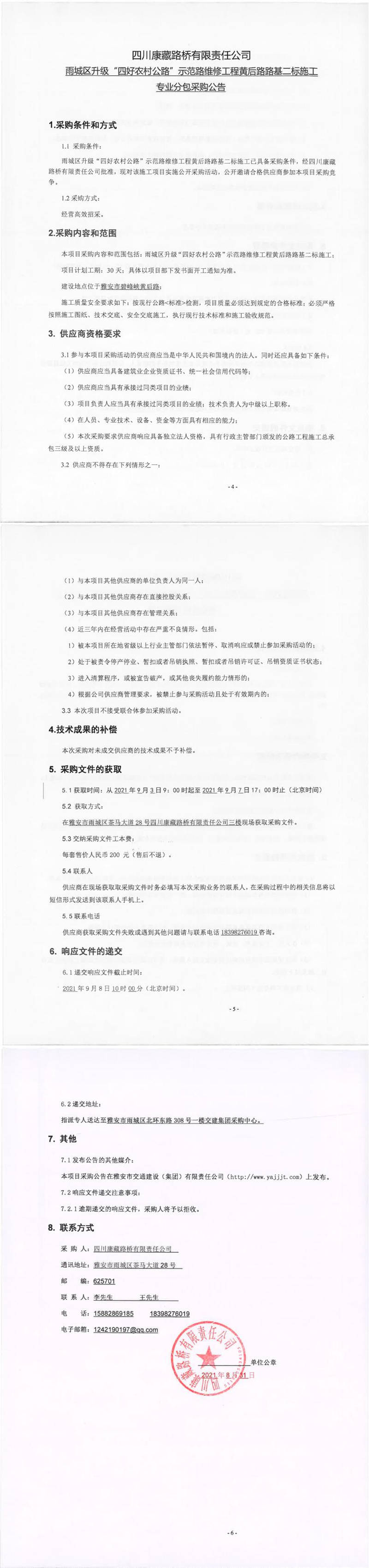 四川康藏路橋有限責(zé)任公司雨城區(qū)升級(jí)“四好農(nóng)村公路”示范路維修工程黃后路路基二標(biāo)施工專(zhuān)業(yè)分包采購(gòu)公告