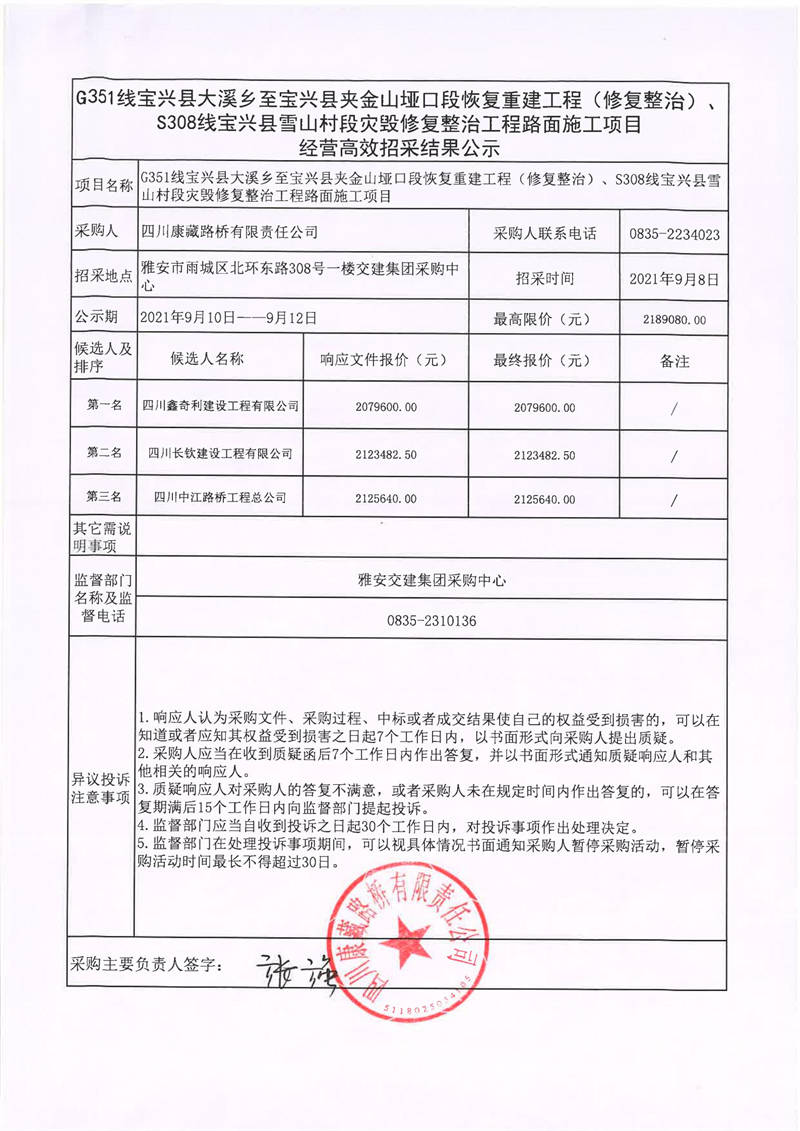 四川康藏路橋有限責(zé)任公司G351線(xiàn)寶興縣大溪鄉(xiāng)至寶興縣夾金山啞口段恢復(fù)重建工程(修復(fù)整治)、S308線(xiàn)寶興縣雪山村段災(zāi)毀修復(fù)整治工程路面施工項(xiàng)目經(jīng)營(yíng)高效招采結(jié)果公示