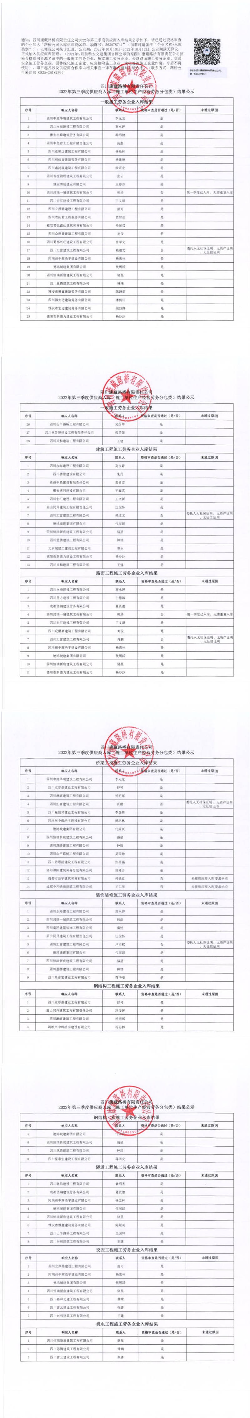 四川康藏路橋有限責(zé)任公司2022年第三季度供應(yīng)商入庫(kù)(施工單位生產(chǎn)經(jīng)營(yíng)勞務(wù)分包類)結(jié)果公示