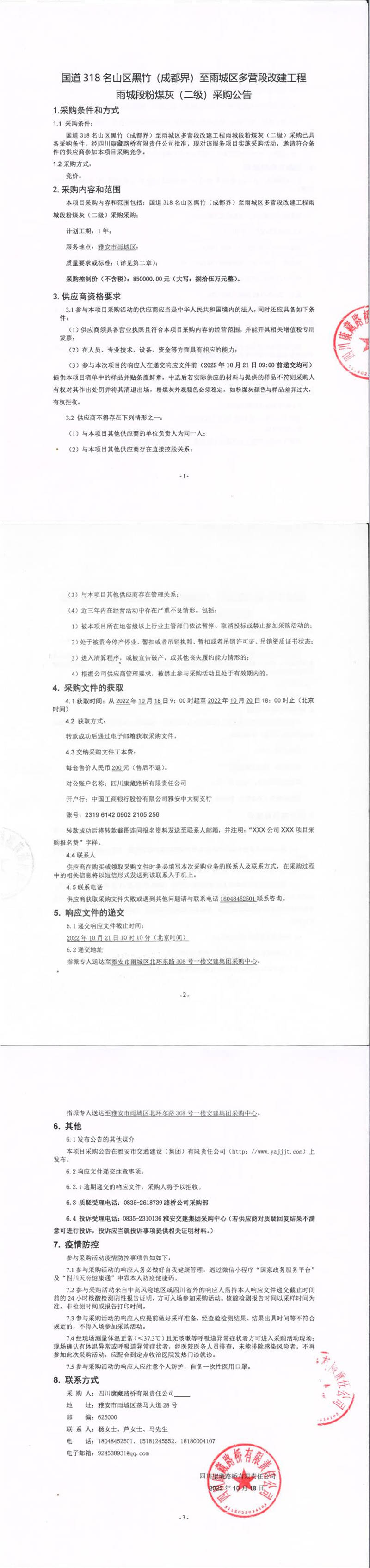 四川康藏路橋有限責任公司國道318名山區(qū)黑竹(成都界)至雨城區(qū)多營段改建工程雨城段粉煤灰(二級)采購公告