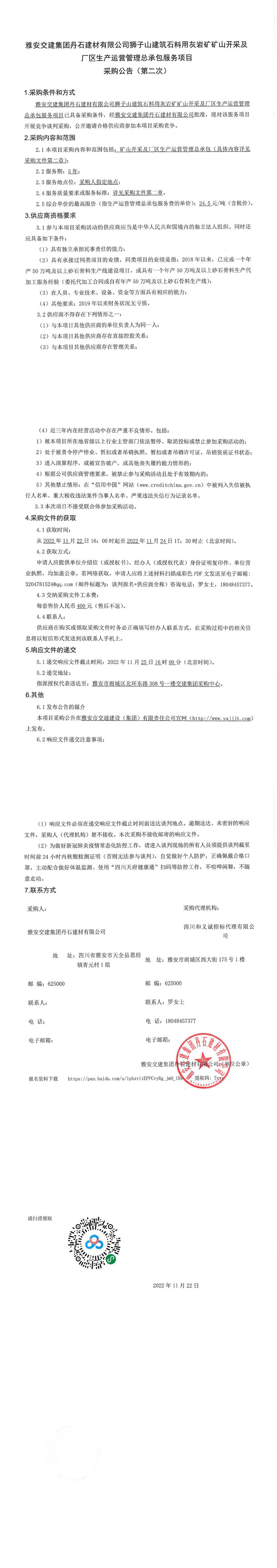 雅安交建集團丹石建材有限公司獅子山建筑石料用灰?guī)r礦礦山開采及廠區(qū)生產運營管理總承包服務項目采購公告(第二次)