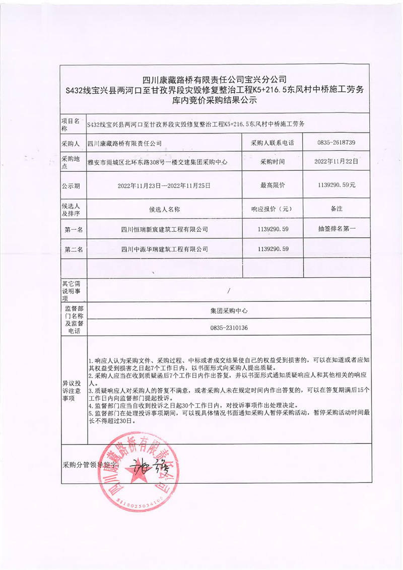 四川康藏路橋有限責(zé)任公司寶興分公司S432線寶興縣兩河口至甘孜界段災(zāi)毀修復(fù)整治工程K5+216.5東風(fēng)村中橋施工勞務(wù)庫(kù)內(nèi)競(jìng)價(jià)采購(gòu)結(jié)果公示