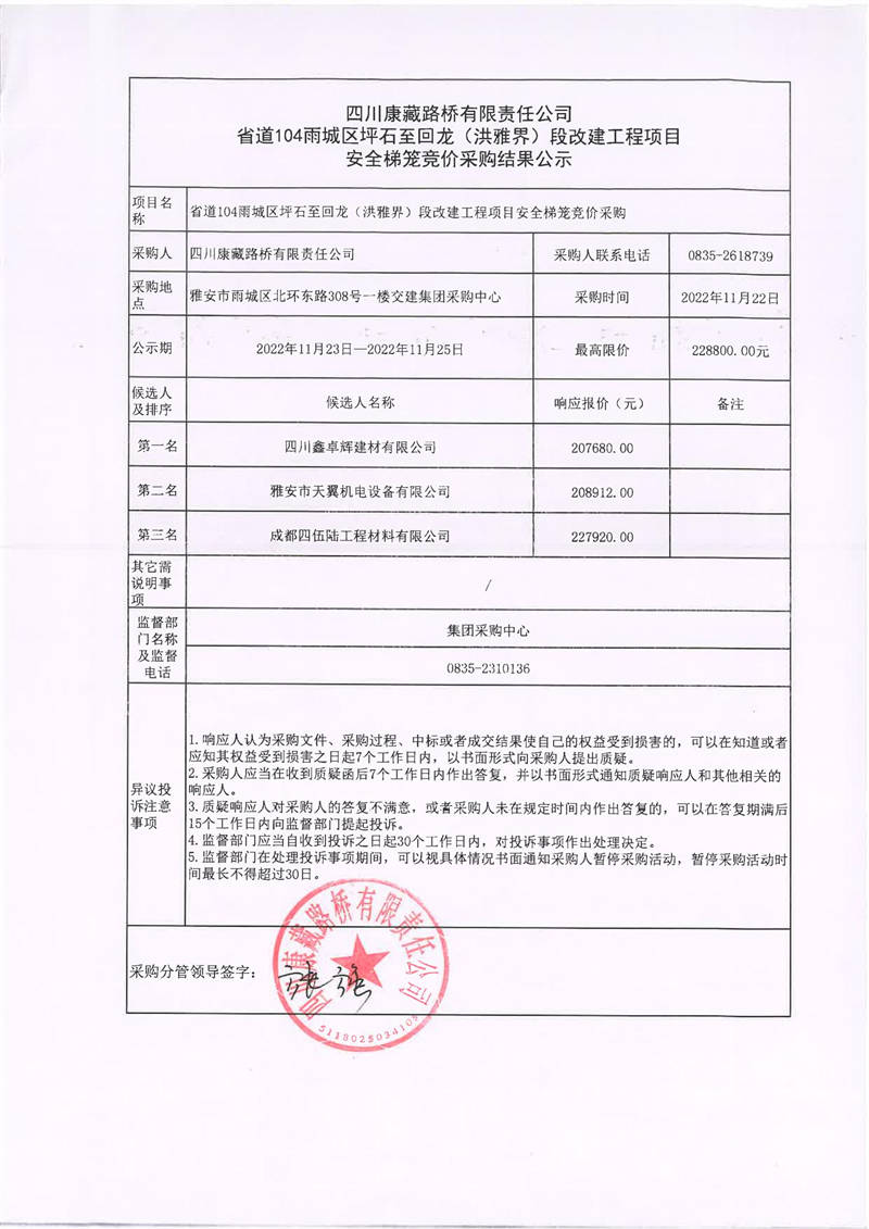 四川康藏路橋有限責(zé)任公司省道104雨城區(qū)坪石至回龍(洪雅界)段改建工程項目安全梯籠競價采購結(jié)果公示