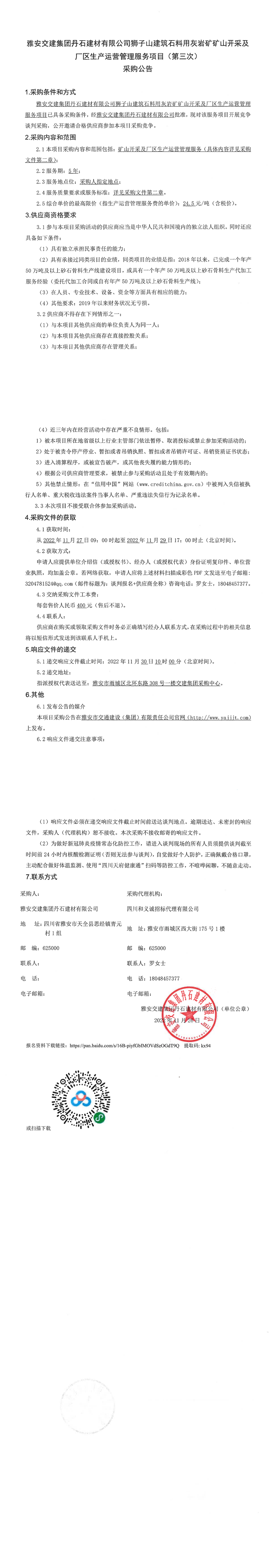 雅安交建集團(tuán)丹石建材有限公司獅子山建筑石料用灰?guī)r礦礦山開采及廠區(qū)生產(chǎn)運(yùn)營(yíng)管理服務(wù)項(xiàng)目(第三次)采購(gòu)公告