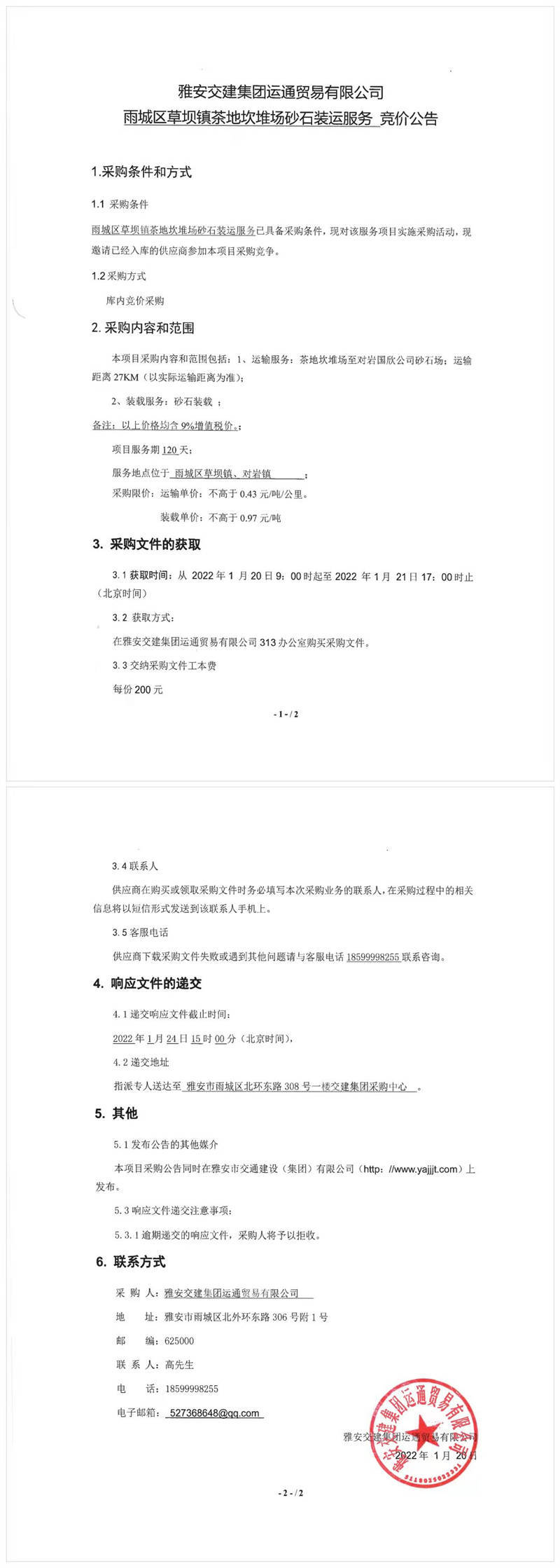 雅安交建集團(tuán)運(yùn)通貿(mào)易有限公司雨城區(qū)草壩鎮(zhèn)茶地坎堆場砂石裝運(yùn)服務(wù)競價公告