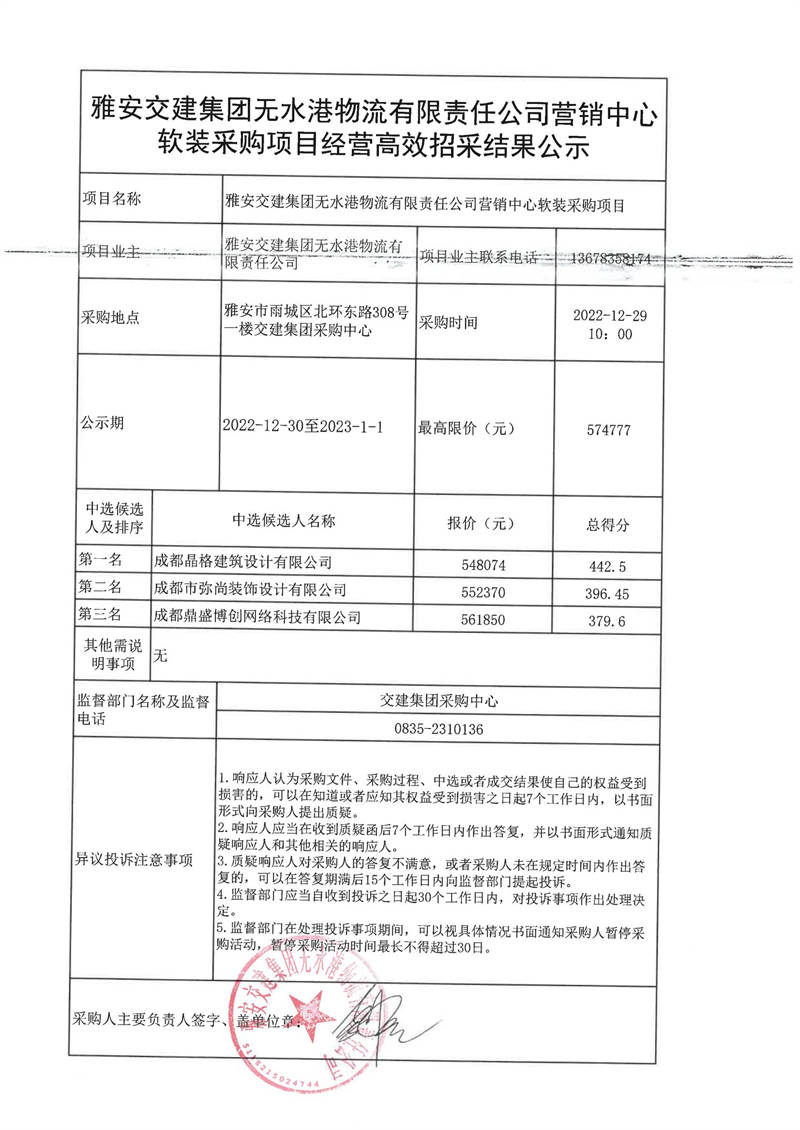 雅安交建集團無水港物流有限責任公司營銷中心軟裝采購項目經(jīng)營高效招采結(jié)果公示