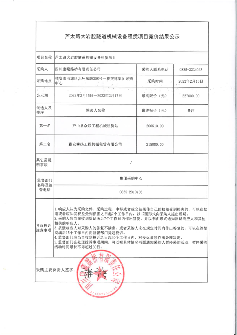 四川康藏路橋有限責(zé)任公司蘆太路大巖腔隧道機(jī)械設(shè)備租賃項(xiàng)目競(jìng)價(jià)結(jié)果公示