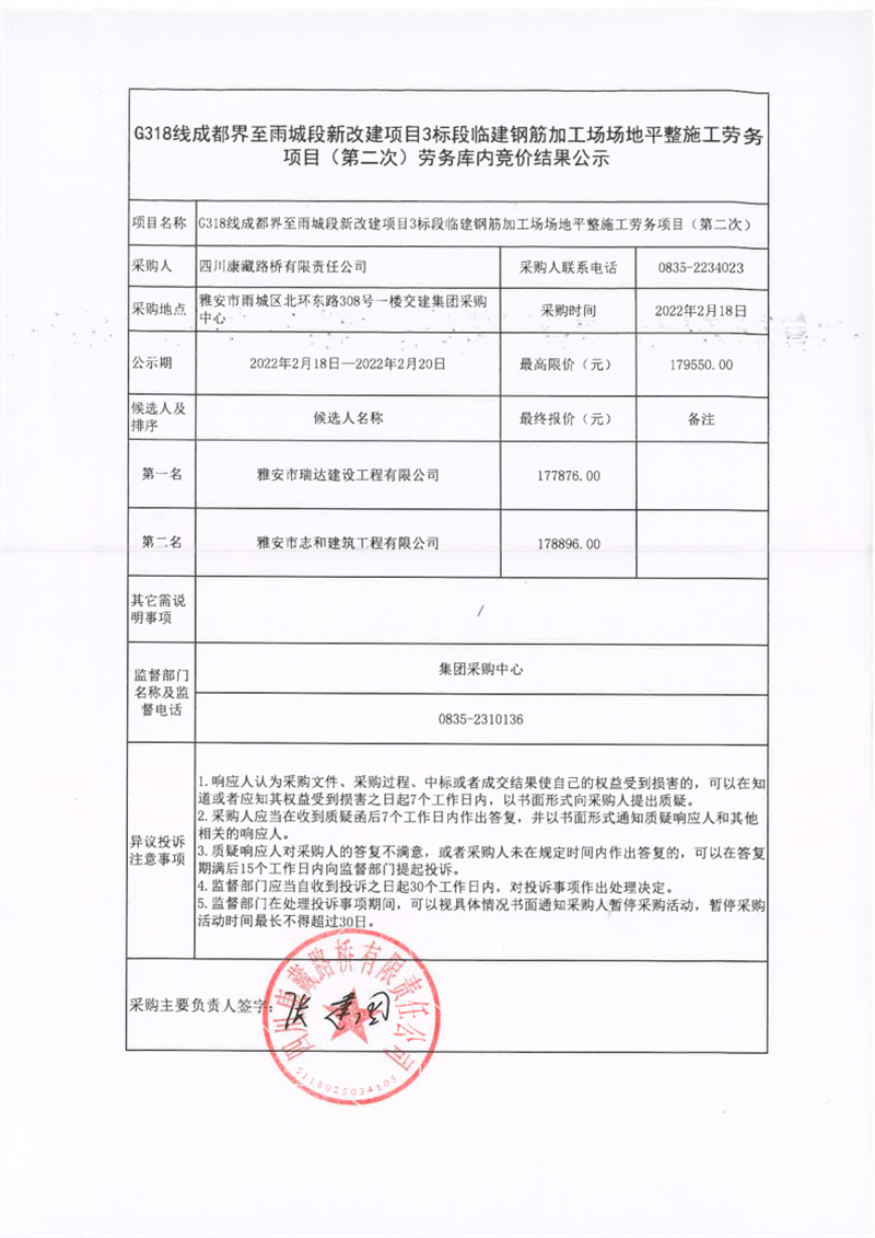 四川康藏路橋有限責(zé)任公司G318線成都界至雨城段新改建項(xiàng)目3標(biāo)段臨建鋼筋加工場場地平整施工勞務(wù)(第二次)庫內(nèi)競價(jià)結(jié)果公示
