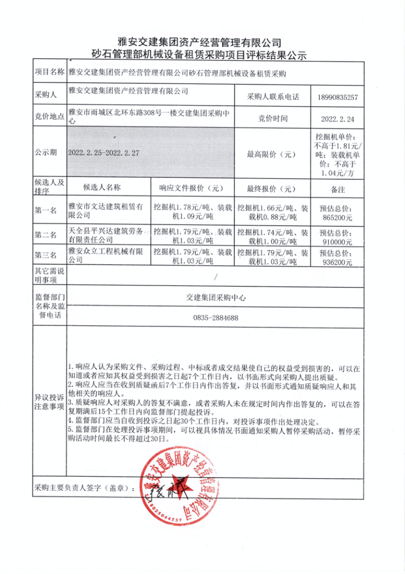 雅安交建集團(tuán)資產(chǎn)經(jīng)營管理有限公司砂石管理部機(jī)械設(shè)備租賃采購項(xiàng)目評標(biāo)結(jié)果公示