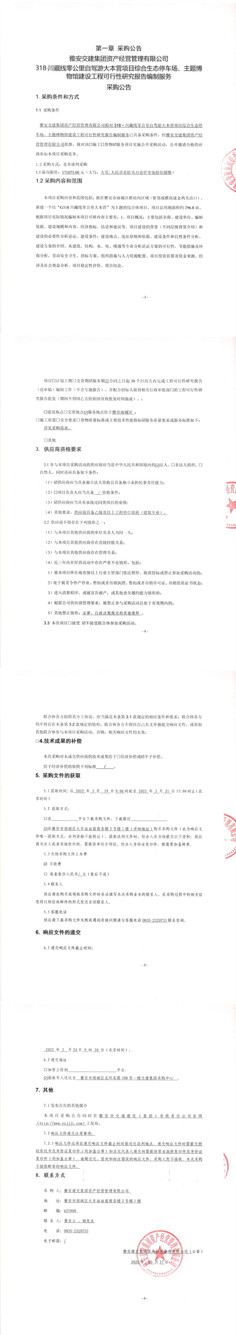 雅安交建集團(tuán)資產(chǎn)經(jīng)營(yíng)管理有限公司318.川藏線零公里自駕游大本營(yíng)項(xiàng)目綜合生態(tài)停車(chē)場(chǎng)、主題博物館建設(shè)工程可行性研究報(bào)告編制服務(wù)采購(gòu)公告