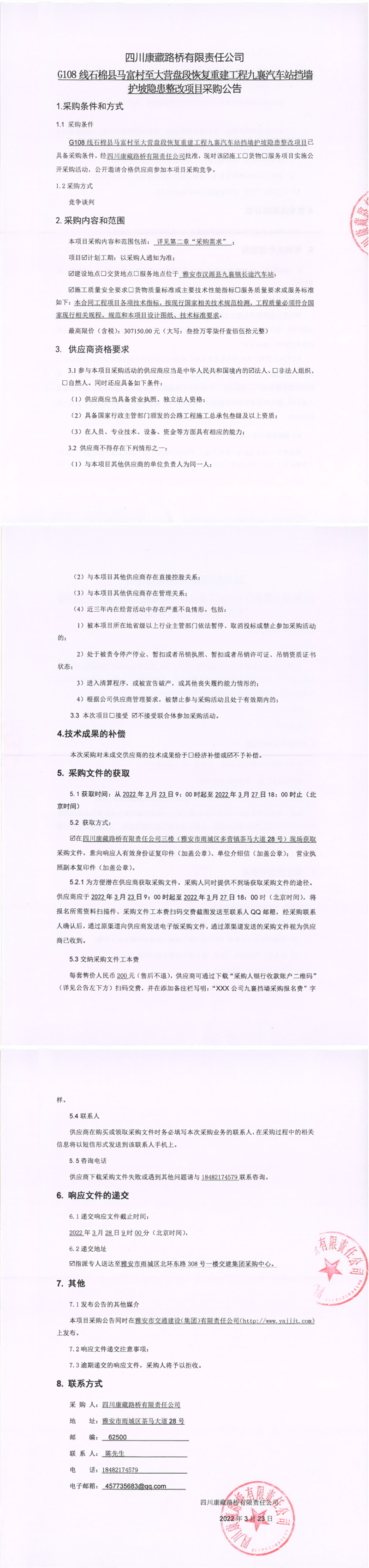 四川康藏路橋有限責(zé)任公司G108線石棉縣馬福村至大營盤段恢復(fù)重建工程九襄汽車站擋墻護坡隱患整改項目采購公告