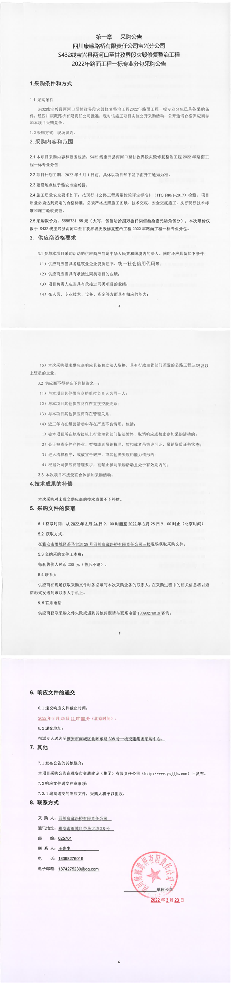四川康藏路橋有限責任公司S432線寶興縣兩河口至甘孜界段災(zāi)毀修復(fù)整治工程2022年路面工程一標專業(yè)分包采購公告
