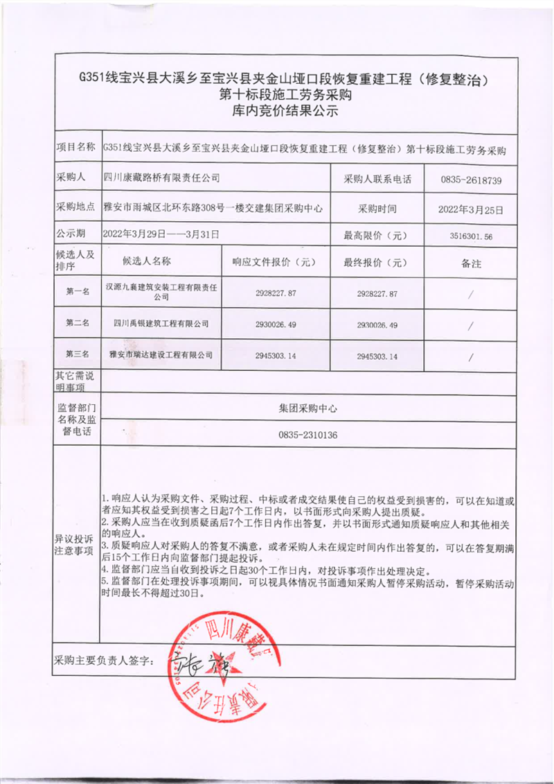 四川康藏路橋有限責(zé)任公司寶興分公司G351線寶興縣大溪鄉(xiāng)至寶興縣夾金山埡口段恢復(fù)重建工程(修復(fù)整治)第十標(biāo)段施工勞務(wù)采購庫內(nèi)競(jìng)價(jià)結(jié)果公示