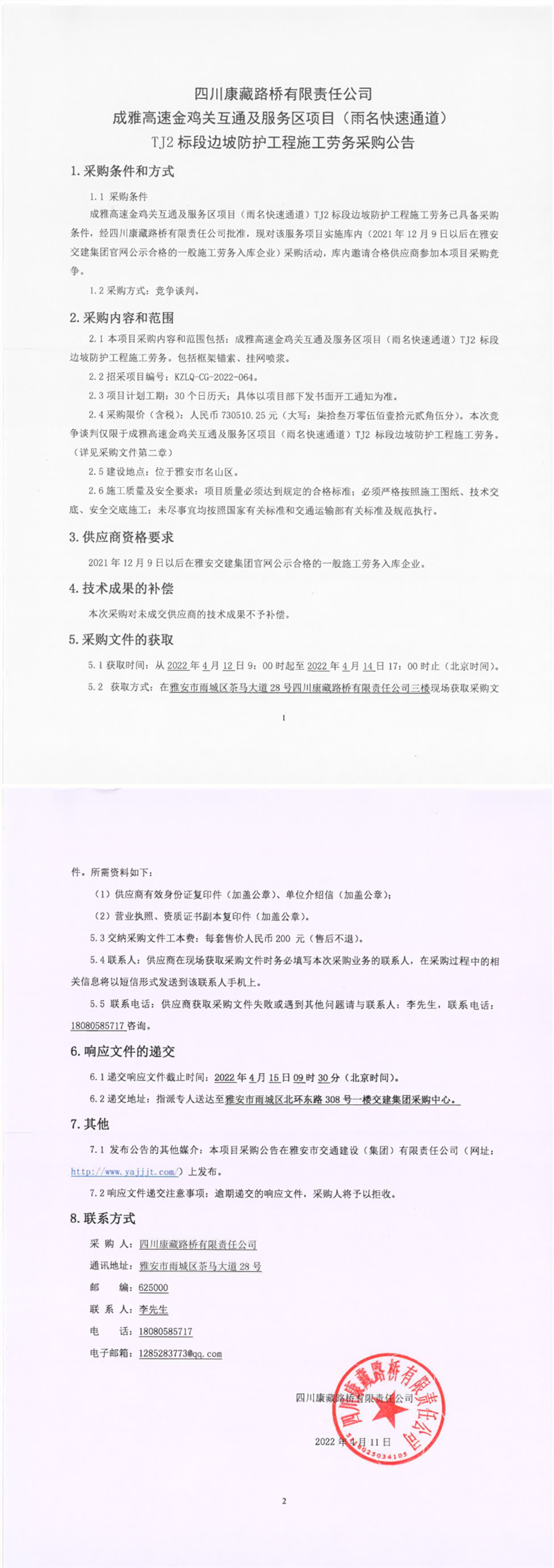 四川康藏路橋有限責任公司成雅高速金雞關互通及服務區(qū)項目(雨名快速通道)TJ2標段邊坡防護工程施工勞務采購公告