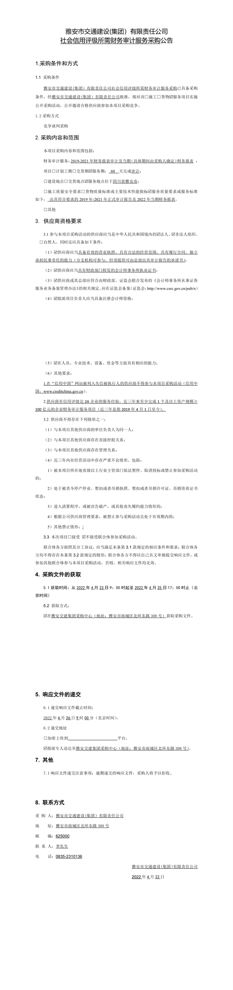 雅安市交通建設(shè)(集團(tuán))有限責(zé)任公司社會信用評級所需財務(wù)審計服務(wù)采購公告