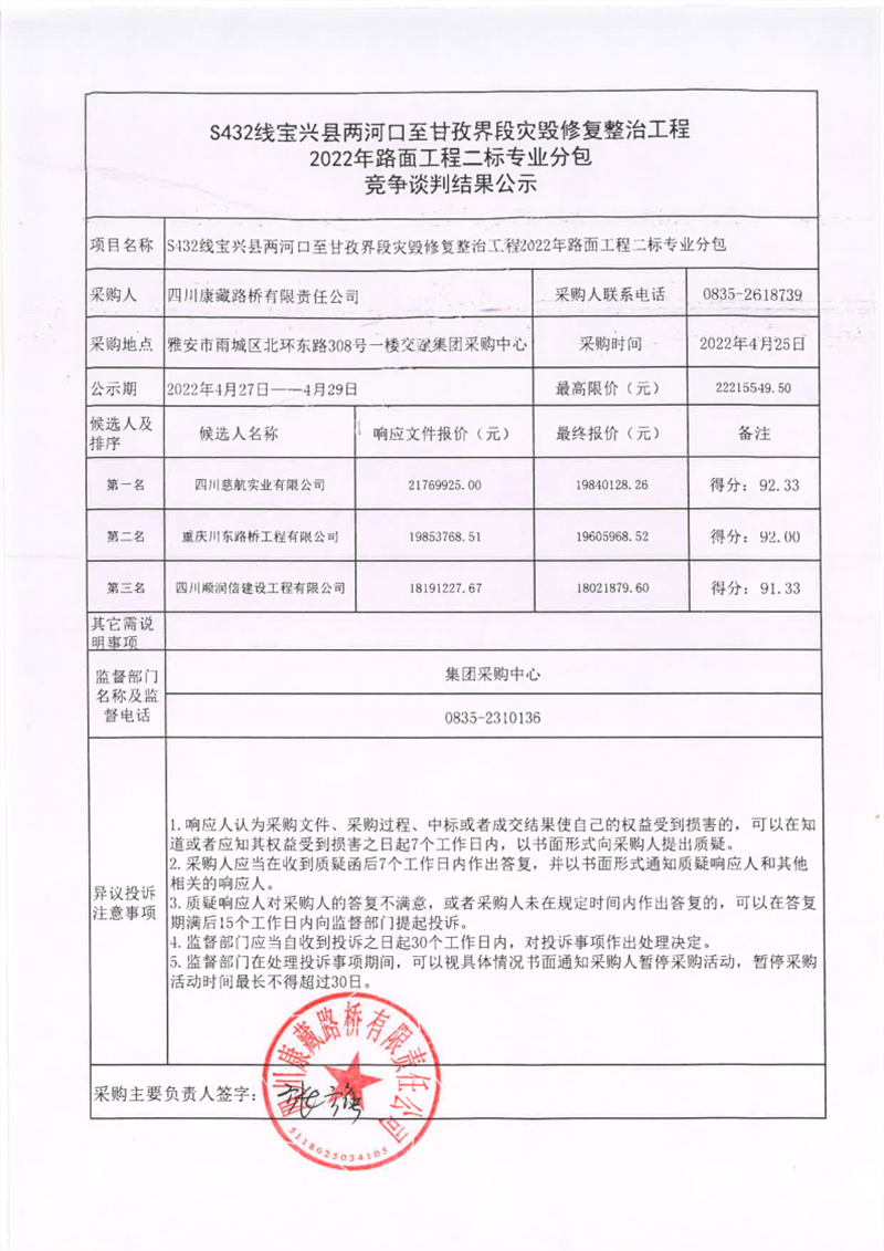 四川康藏路橋有限責(zé)任公司S432線寶興縣兩河口至甘孜界段災(zāi)毀修復(fù)整治工程2022年路面工程二標(biāo)專業(yè)分包競(jìng)爭(zhēng)談判結(jié)果公示